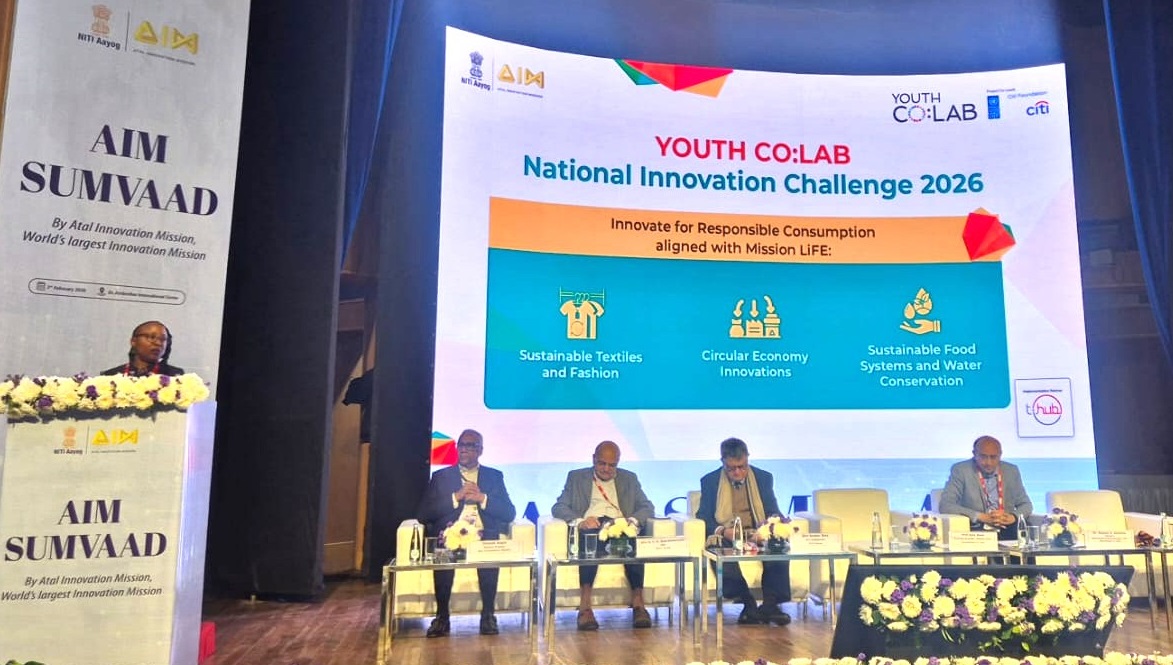 5th February, 2026, New Delhi: The Youth Co:Lab National Innovation Challenge 2026 was launched on 3rd February, opening applications for youth-led startups across India developing innovative and practical solutions that promote responsible consumption, aligned with the Government of India’s Mission LiFE (Lifestyle for Environment). The launch took place during AIM SUMVAAD, the flagship annual conclave of the Atal Innovation Mission (AIM), NITI Aayog, Government of India. The event brought together representatives from all Atal Incubation Centres (AICs) and Atal Community Innovation Centres (ACICs), world-class incubators across the country along with leading industry experts, CSR leaders, policymakers, mentors, and innovation ecosystem stakeholders. Representatives from AIM, UNDP and Citi Foundation outlined the focus and opportunities under the 2026 edition of Youth Co:Lab.